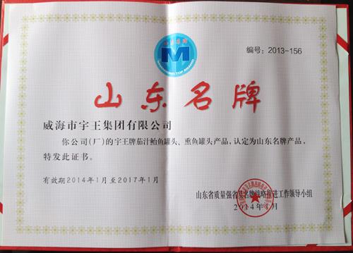 今日,我公司的宇王牌茄汁鮐魚罐頭、熏魚罐頭產品被山東省質量強省級名牌戰略推進工作領導小組評為山東名牌產品。